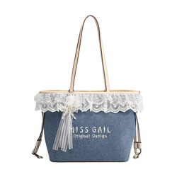 Bolsa Tote de Denim com Detalhes em Renda e Franjas para Mulheres 2026, Bolsa de Ombro Grande de Capacidade Original do Designer 8152