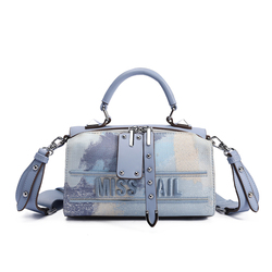 Bolsa Boston Feminina Azul Claro Bordada com Estampa da Moda, Detalhe de Tachas de Designer, Bolsa de Mão em Tecido Premium, Bolsa Transversal 6232